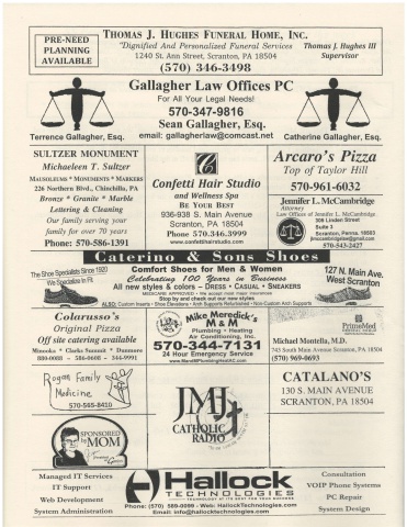 PRE-NEEDPTANNINGAVAILABLETnonnas J. Hucuns FuNnnal llonnn, INC.\ And Personalized Funeral Seruices Thomas l. Hughes III\\240 St. Ann Street, Scranton, PA 18504 Supervisor570) s46-3498Gallagher Law Offices PCFor All Your Legal Needs!570-347-9816Sean Gallagher, Esq.Terrence Gallagher, Esq. email: gallagherlaw@comcast.net Catherine Gallagher, Esq.SULTZER MONUMENTMichaeleen T. SultzerMAUSoLEUMS * MoNutrrpl.trs * MARKERS226 Northern Blvd., Chinchilla, PABronze * Granite * MarbleLettering & CleaningOur family serving yourfamily for over 70 yearsPhone: 570-586-1391rn. Sno. Qpetqlltts*J9|OColarusso'sOriginal PizzaOff site catering availnbleMinooka * Clarks Summit * Dunmore880-0088 - 5860608 - 3&9991Gomfort Shoes for Men & Womeneelzntarrrd\All new styles & colors - DRess . Clsunt ' SruelxensMEDICARE APPROVED . we a@pt rct maior insurancsStop by and check out our new stYlesCustom lnserts . Shoe Elevations. Arch Supports Refurbished' Non-Custom ArchMichael Montella, M.D.743 South Main Avenue Scrarton, PA 18504(s70) 969-0693CATALANO'S130 S. MAIN AVENUESCRANTON, PA 18504ConsultationVOIP Phone SysternsPC RepairSystern DesignArcaro' s PizzaTop of Taylor Hill570-961-6032Jennifer L. McCambridgeAttorneyLaw Offices of Jennifer L. McCambridge@;*'*i#**xPrimeMed NEDICTq CNOUPManaged IT SenricesIT Suppottr07eb DeveloprnentSys tern AdrninistrationHallockr E F.,u.\ k.,q\Phone: (57O) 589-0O99 - Web: HallockTechnologies.comand Wellness SpaBr Youn Bnsr936-938 S. Main AvenueScranton, PA 18504Phone 570.346.3999www.confettihai rstudio.com,r;ffi '#i'if*,'Plumbing . HeatingAir Conditioning, lnc. 570-344-713124 Hour Emergency ServiceSPONSOREDl',MoM i\\r:!/ Ii' \|qeJi.;neEmail: info@hal locktechnologies.comConfetti Hair StudioCaterino & Sons Shoes',iI.$gi*':