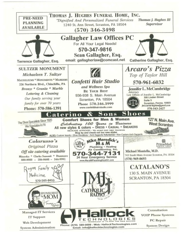 PRE-NEEDPLANNINGAVAILABLETHOMAS J. HUGHES FUNERAL HOME, INC.\1240 St. Ann Street, Scranton, PA 18504 SupervisorTerrence Gallagher, Esq.(570) 346-3498Gallagher Law Offices PCSULTZER MONUMENTMichaeleen T. SultzerMAUSOLEUMS * MONUMENTS * MARKERS226 Northern Blvd., Chinchilla, PABronze * Granite * MarbleLettering & CleaningOur family serving yourfamily for over 70 yearsPhone: 570-586-1391For All Your Legal Needs!570-347-9816Sean Gallagher, Esq.email: gallagherlaw@comcast.netConfetti Hair Studioand Wellness SpaBE YOUR BEST936-938 S. Main AvenueScranton, PA 18504Phone 570.346.3999www.confettihairstudio.comCatherine Gallagher, Esq.Arcaro's PizzaTop of Taylor Hill570-961-6032Jennifer L. McCambridgeAttorneyLaw Offices of Jennifer L. McCambridge305 Linden StreetSuite 3Scranton, Penna. 18503jlmccambridgelaw@gmail.com570-543-2427Caterino & Sons ShoesThe Shoe Specialists Since 1920We Specialize In FitComfort Shoes for Men & WomenCelebrating 100 Years in BusinessAll new styles & colors - DRESS CASUAL SNEAKERSMEDICARE APPROVED We accept most major insurancesStop by and check out our new stylesALSO: Custom Inserts Shoe Elevations Arch Supports Refurbished Non-Custom Arch SupportsColarusso'sOriginal PizzaOff site catering availableMinooka * Clarks Summit * Dunmore880-0088 - 586-0608 - 344-9991Rogan FamilyMedicine570-565-8410SPONSOREDby MOMPresidentGreriysManaged IT ServicesIT SupportWeb DevelopmentSystem AdministrationMikeM Meredick'Plumbing & MHeatingAir Conditioning, Inc.570-344-7131AIK CONUT24 Hour Emergency Servicewww.MandMPlumbingHeatAC.comCATHOLICJMRADIO750AM 1490AM98.9 127 N. Main Ave.West ScrantonPrimeMed NEDICAL GROUPMichael Montella, M.D.743 South Main Avenue Scranton, PA 18504(570) 969-0693CATALANO'S130 S. MAIN AVENUESCRANTON, PA 18504TECHNOLOGIES-TECHNOLOGY AT ITS BEST FOR YOUR SUCCESSPhone: (570) 589-0099 - Web: HallockTechnologies.comEmail: info@hallocktechnologies.comConsultationVOIP Phone SystemsPC RepairSystem Design