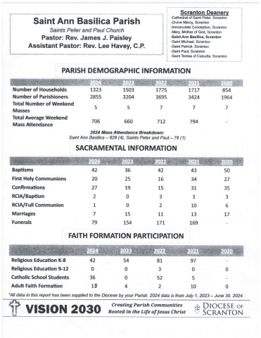 Saint Ann Basilica ParishSainfs Peter and Paul ChurchPastor: Rev. James J. PaisleyAssistant Pastor: Rev. Lee Havey, G.P.PARISH DEMOGRAPH IC INFORMATIONtt[\Scranton Deanerv4athedral of Saint Peter, Scranton-Divine Mercy, Scranton-lmmaculate Conception, Scranton-Mary, Mother of God, Scranton%u20acaint Ann Basilica, Scranton-Saint Michael, Scranton-Saint Patrick, Scranlon-Saint Paul, Scranton-Saint Teresa of Calo.rtta, Scranton{iI17\\73424794Number of HouseholdsNumber of ParishionersTotal Number of WeekendMassesTotal Average WeekendMass Attendance.{tli:': \,:13232855706 660 7L22024 Mass Attendance Brcakdown:Saint Ann Basilica - 628 (4), Saints Peter and Paul- 78 (1)7BaptismsFirst Holy CommunionsConfirmationsRCIA/BaptismRCIA/Full CommunionMarriagesFunerals4220272!7793625190015L5442161532LlL71,4334313101316950273536L7FAITH FORMATION PARTICIPATIONReligious Education K-8 42Religious Education 9-12 0Catholic School Students 36Adult Faith Formation 105400481 9730052s2100*All data in this rcWft has been supplied to the Dioese by your Paish. 2024 data is from July 1, 2023 - June 30, 2024.DtocEsE or v I s I o N 2 0 3 0 .x::;T: :;',:;,':;::::;?,\ScnnNToN1s03 L7753204 359557
