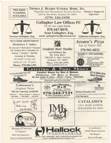 PRE-NEEDPLANNINGAVAILABLETuonr.rs J. Hucuns FuNrnnl Honnn, [NC.\ And Personalized Funeral Seruices Thomas J. Hughes IIIL240 St. Ann Street, Scranton, PA 18504 Supervisor570) 346-3498Terrence Gallagher, Esq.SULTZER MONUMENTMichaeleen T. SultzerMlusolruus * MoNUMEvrs + MlmBns226 Northern Blvd., Chinchilla, PABronze * Granite * MarbleLettering & CleaningOur family serving yourfamily for over 70 yearsPhone: 570-586-1391the Slroe SPeoalBts Sirye 1920Cola,russo'sOriginal PizzaOff site catering availableMinooka * Clarks Sumrnit * Dunmore880-0088 - 586-0608 - 344-999rGallagher Law Offices PCFor All Your Legal Needs!570-347-9816Sean Gallagher, Esq.email : gallagherlaw@comcast.netHallockTla r\ ^s\ k\,?\Catherine Gallagher, Esq.Gomfort Shoes for Men & WomenOele*aZr*ry 7OO ?/earo