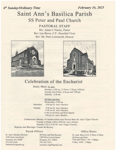 6'h Sunday/Ordinary Time February 16, 2025Saint Ann's Basilrca ParishSS Peter and Paul ChurchPASTORAL STAFFRev. James J. Paisley, PastorRev. Lee Havey, C.P., Parochial VicarRev. Mr. Peter Lemoncelli, DeaconCelebration of the EucharistDaily Mass: St. Ann:Mondays: 8:00 am, 12 Noon,3:30 pm,6:00 pmTuesday thru Friday: 8:30 am and 7:00 pmSaturday: 8:30 amSS Peter and Paul:Wednesdays: 9:00 amSaturday: 4:00 pm St. Ann's BasilicaSunday 8:30 am St. Ann's Basilica11:00 am St. Ann's Basilica11:00 am SS Peter and Paul Church7:00 pm St. Ann's BasilicaConfessions: Monday: 45 minutes before each Novena Mass (St. Ann's Upper Church)Tuesday to Friday 1:00 to 5:00 (St. Ann's Shrine)Saturday 2:30 to 3:30 (St. Ann's Upper Church)Baptism and Marriage: Contact the RectoryParish OfficesSt. Ann's Basilica Rectory1250 Saint Ann StreetScranton, PA 18504570-342-5t66Stannsbasilicaparish.orgSS Peter and Paul Rectory1309 West Locust StreetScranton, PA. 18504570-343-70t5secretary.sspp@ gmail.comOffice HoursSt. Ann: Mon to Fri: 9:30am-4:30pmSS Peter and Paul:Tues and Thurs: l:30 - 4:00pmFriday:8:00-3:00pm
