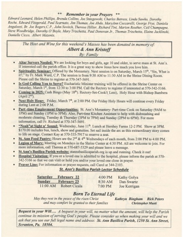 'k* Remember in your Prayers :1.:l%u20acEdward Leonard, Helen Phillips, Brenda Collins, Joe Sniegowski, Charles Betress, Linda Sawko, DorothyRoche, Edvvard Fitzgerald, Paul Scarnato, Jim Thomas, Joe Abdo, MaryAnn Ceccarelli, George Frye, DanielaAngalozzi, Br. Joe Rogers,C.P., John Sovitch, Theresa Hillier, Richard Tini, Marion Reuther, Ceil Champagne,Steve Woodbridge, Dorothy O'Boyle, MaryTrischetta, Paul DonovanJr., Thomas Trischetta, Elaine laikltnski,Danielle Cicco, Albert Mazonis.The Host and Winefor this weekend's Masses has been donated in memory of:Albert & Ann Kristoff: FamiAltar Servers Needed: We are looking for boys and girls, age 10 and older, to serve mass at St. Ann's.If interested call the parish office. It is a great way to show Jesus how much you love him.Sniritualitv Seminar: Offered by the Monastery. Next session is on Saturday, March l5ft, \ What isit?,\ Fr. Mark Ward, C.P. The session is from 9:30 AM to 11:30 AM in the Shrine Dining Room.Please call the Shrine to register at 570-347-5691.Is God Calline You to Serve? Eucharistic Minister training will be offered in the Shrine Center onSaturday, March 1't, from 12:30 to 3:00 PM. Call the Rectory to register if interested, at 570-342-5t66.Coming in 2025: Cash Bingo (May 18th). Rectory-Set-Cook!( Lent), Holy Hour with Bishop Bambera(April2'd).Next Holv Hour: Friday, March 'lth, at2:00 PM. Our Friday Holy Hours will continue every Fridayduring Lent at 2:00 P.M.Part -time Emplovment Opnortunities: St. Ann's Monastery- Part-time Cook on Saturday (9AM to1PM) and Sunday (1PM to 5PM). Also, Part-time Kitchen Assistant to help with dishwashing andmoderate cleaning, Tuesday & Thursday (3PM to 7PM) and Sunday (2PM to 6PM). For moreinformation, call Fr. Richard at 57 0-347-5691.\ Sisht n' Sound: Wednesday, June 1lft. Lunch at Hershey Farms l2-2PM. Show at 3PM.$170.00 includes bus, lunch, show and gratuities. Set sail inside the arc as this extraordinary story comesto life on stage. Contact Kay at 570-335-7917 to reserve a seat.St. Ann Food Pantrv: Hours are the 2\ &4th Wednesdays of each month, from 2:00 PM to 4:00 PM.Leeion of Marv: Meeting on Mondays in the Shrine Center at 4:30 PM. All are welcome to join. Formore information, call Theresa at 570-687-5329 and please leave a message.St Ann's Basilica Parish website: stannsbasilicaparish.org is up and running. Check it out!Hosnital Visitation: If you or a loved one is admiued to the hospital, please inform the parish at 570-342-5166 so that we can visit or hold you and/or your loved one close in prayer.Praver Line: For information or prayer requests, call Carol at344-2103.St, Ann's Bosilico Parish Lector ScheduleSaturday Februarv 22Sunday Februarv23I l:00 AM Robert Cicalaoaaa4:00 PM Kathy Golya8:30 AM Dan Swartz7:00 PM Joe KerriganBorn To Eternal LdeMay they rest in the peace of the risen Christand may comfort be granted to their familiesBequest in your Will.... A bequest in your will, no matter what the amount, will help the Parishcontinue its mission of sertting God's people. Please consider us when making your will and weask that you use our full legal name and address: ^St Ann Basilica Parish, 1250 St. Ann Street,Scranton, Pa. 18504.Kathryn Bingham Rick PetersChristopher Musti
