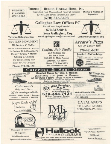 PRE.NEEDPLANNINGAVAILABLETuonn\. Hucurs Fuxnn.q,l llonnn, INC.\ And Personalized Furueral Seruices Thomas J, Hughes III1240 St. Ann Street, Scranton, pA 19504 supervisor570) 346-3498For All Your Legal Needs!570-347-9816Sean Gallagher, Esq.Terrence Gallagher, Esq. email: gallagherlaw@comcast.net Catherine Gallagher, Esq.Arcaro's PizzaTop of Taylor Hill570-961-6032Jennifer L. McCambridgeAttorneyLaw Offices of Jennifer L. McCambridge@,S',.#*[ffi\fte Shoe SPeoalists SiLce 1920 ,i[it$m,;MEDICARE APPROVED ' We a66pt most major insurancesStoP bY and check out our new stYlesCustom lnserts . Shoe Elev-ations'Arch Supports Refurbished'Non-Custom ArchSULTZER MONUMENTMichaeleen T. SultzerMeusomuus * MoNutrsNrs + Manxrns226 Northern Blvd., Chinchilla' PABronze * Granite * MarbleLettering & CleaningOur family serving yourfamily for over 70 yearsPhone: 570-586-1391Cola,russo'sOriginal PizzaOff site catering availqbleMinooka * Clarks Sumrnit * Dunmore880-0088 - 586-0608 - 344-999rGomfort Shoes for Men & Womeneekiaar
