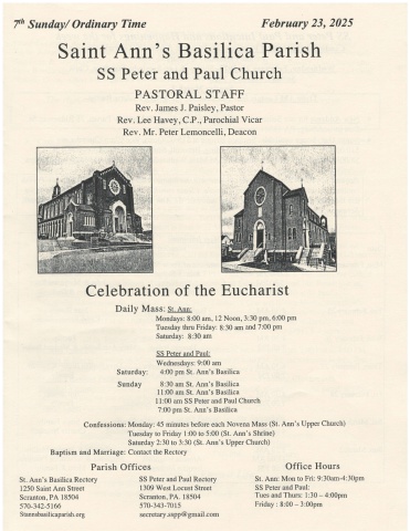 Vh Sunday/ Ordinary Time February 23, 2025Saint Ann's Basilrca ParishSS Peter and Paul ChurchPASTORAL STAFFRev. James J. Paisley, PastorRev. Lee Havey, C.P., Parochial VicarRev. Mr. Peter Lemoncelli, DeaconCelebration of the EucharistDailv Mass: St. Ann: J,Mondays: 8:00 am, 12 Noon,3:30 Pm,6:00 PmTuesday thru Friday: 8:30 am and 7:00 pmSaturday: 8:30 amSS Peter and Paul:Wednesdays: 9:00 amSaturday: 4:00 pm St. Ann's BasilicaSunday 8:30 am St. Ann's Basilica11:00 am St. Ann's Basilica11:00 am SS Peter and Paul Church7:00 pm St. Ann's BasilicaConfessions: Monday: 45 minutes before each Novena Mass (St. Ann's Upper Church)Tuesday to Friday 1:00 to 5:00 (St. Ann's Shrine)Saturday 2:30 to 3:30 (St. Ann's Upper Church)Baptism and Marriage: Contact the RectoryOffice HoursSt. Ann: Mon to Fri: 9:30am-4:30pmSS Peter and Paul:Tues and Thurs: l:30 - 4:00prnFriday:8:00-3:00pmParish OfficesSt. Ann's Basilica Rectory1250 Saint Ann StreetScranton, PA 18504570-342-5t66Stannsbasilicaparish.orgSS Peter and Paul Rectory1309 West Locust StreetScranton, PA. 18504570-343-70t5secretary.sspp@ gmail.com