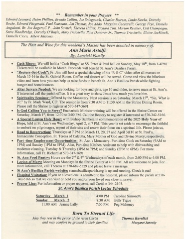 ** Remember in your Prayers :rc*Edward Leonard, Helen Phillips, Brenda Collins, Joe Sniegowski, Charles Betress, Linda Sawko, DorothyRoche, Edward Fitzgerald, Paul Scarnato, Jim Thomas, Joe Abdo, MaryAnn Ceccarelli, George Frye, DanielaAngalozzi, Br. Joe Rogers,C.P., John Sovitch, Theresa Hillier, Richard Tini, Marion Reuther, Ceil Champagne,Steve Woodbridge, Dorothy O'Boyle, Mary Trischetta, Paul Donoyan Jr., Thomas Trischetta, Elaine Jacklinski,Danielle Cicco, Albert Mazonis.The Host and Winefor this weelcend's Masses has been donated in memory ofAnn Marie Astoffi': Lencicki Fami,o Cash Binso: We will hold a \ Bingo\ SS. Peter & Paul hall on Sunday, May 18ft, from 1-4PM.Tickets will be available in March. Proceeds will benefit St. Ann's Basilica Parish.o *Rectory-Set-Cook\. Jim will host a special showing of his \ video after all masses onMarch 15-16 in the St. Gabriel Room. Coffee and dessert will be served. Come and view the hilariousvideo and learn how you can help us raise funds to benefit St. Ann's Basilica Parish while fightinghunger and homelessness.o Altar Servers Needed: We are looking for boys and girls, age l0 and older, to serve mass at St. Ann's.If interested call the parish office. It is a great way to show Jesus how much you love him..@offeredbytheMonastery.NextsessionisonSaturday,March15s,.oSin,Whatisit?,\ Fr. Mark Ward, C.P. The session is from 9:30 AM to 11:30 AM in the Shrine Dining Room.Please call the Shrine to register at 570-347-5691o Is God Calline You to Serve? Eucharistic Minister training will be offered in the Shrine Center onSaturday, March I't, from 12,30 to 3:00 PM. Call the Rectory to register if interestedat5T0-342-5166.o A Special Lenten Holv Hour: with Bishop Bambera in commemoration of the 2025 Holy Year ofHope, held at St. Ann's on Wednesday, April 2, at7 PM. This year is set aside to encourage the faithfulto embark on pilgrimages, repent of their sins and renew their focus on a spiritual life. Please join us..@Thursdaysat7PMonMarchl3,20,27andApril3&l0atSt.Paul,s,Immaculate Conception, St. Teresa of Calcutta, Mary Mother of God and Divine Mercy, respectively.o Part -time Emnloyment Opnortunities: St. Ann's Monastery- Part-time Cook on Saturday (9AM to1PM) and Sunday (1PM to 5PM). Also, Part-time Kitchen Assistant to help with dishwashing andmoderate cleaning, Tuesday & Thursday (3PM to 7PM) and Sunday (2PM to 6PM). For moreinformation, call Fr. Richard at 570-347-5691..@Hoursarethe2\o Legion of Marv: Meeting on Mondays in the Shrine Center at 4:30 PM. All are welcome to join. Formore information, call Theresa at 570-687-5329 and please leave a message.o St Ann's Basilica Parish website: stannsbasilicaparish.org is up and running. Check it out!o Hospital Visitation: If you or a loved one is admitted to the hospital, please inform the parish at 570-342-5166 so that we can visit or hold you and/or your loved one close in prayer..P@Forinformationorprayerrequests,callCarolat344-2I03,St. Ann's Basilica Porish Lector ScheduleSaturday March I 4:00 PM Caroline SimonettiSundav March 2 8:30 AM Billy Tigue1l:00 AM Jeanne Lally 7:00 PM Peg MahoneyBorn To Eternal LWMay they rest in the peace of the risen Christand may comfort be granted to their familiesThomas KavulichMargaret Janesky