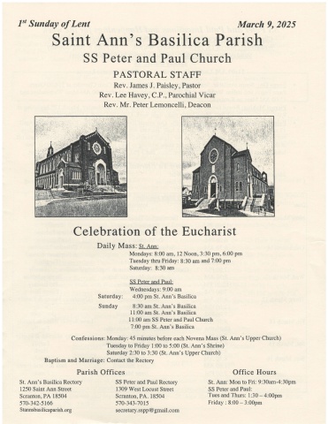 ['t Sundoy of Lent March 9, 2025Saint Ann's Basiltca ParishSS Peter and Paul ChurchPASTORAL STAFFRev. James J. Paisley, PastorRev. Lee Havey, C.P., Parochial VicarRev. Mr. Peter Lemoncelli, DeaconCelebration of the EucharistDaily Mass: st. Ann:Mondays: 8:00 am, 12 Noon,3:30 pm,6:00 pmTuesday thru Friday: 8:30 am and 7:00 pmSaturday: 8:30 amSS Peter and Paul:Wednesdays: 9:00 amSaturday: 4:00 pm St. Ann's BasilicaSunday 8:30 am St. Ann's Basilica11:00 am St. Ann's Basilica11:00 am SS Peter and Paul Church7:00 pm St. Ann's BasilicaConfessions: Monday: 45 minutes before each Novena Mass (St. Ann's Upper Church)Tuesday to Friday 1:00 to 5:00 (St. Ann's Shrine)Saturday 2:30 to 3:30 (St. Ann's Upper Church)Baptism and Marriage: Contactthe RectoryParish Offices Office HoursSt. Ann: Mon to Fri: 9:30am-4:30pmSS Peter and Paul:Tues and Thurs: 1:30 - 4:00pmFriday:8:00-3:00pmSt. Ann's Basilica Rectory1250 Saint Ann StreetScranton, PA 18504570-342-5166Stannsbasilicaparish.orgSS Peter and Paul Rectory1309 West Locnst StreetScranton, PA. 18504570-343-70t5secretary.sspp@ gmail.com