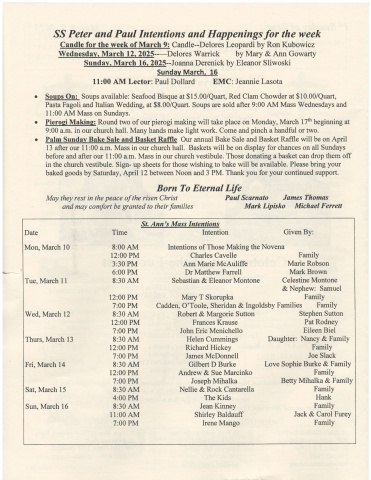 SS Peter and Paul Intentions snd Happenings for the weekCandle for the week of March 9: Candle--Delores Leopardi by Ron KubowiczWednesdav. March 12.2025---Delores Warrick by Mary & Ann GowartySunday, March 16. 2025--Joanna Derenick by Eleanor SliwoskiSundav March. 16Ll:00 AM Lector: Paul Dollard EMC: Jeannie LasotaSouns On: Soups available: Seafood Bisque at $15.00/Quart, Red Clam Chowder at $10.00/Quart,Pasta Fagoli and Italian Wedding, at $8.00/Quart. Soups are sold after 9:00 AM Mass Wednesdays and11:00 AM Mass on Sundays.Pieroei Making: Round two of our pierogi making will take place on Monday, March 17th beginning at9:00 a.m. in our church hall. Many hands make light work. Come and pinch a handful or two.Palm Sundav Bake Sale and Basket Raffle Our annual Bake Sale and Basket Raffle will be on April13 after our I 1:00 a.m. Mass in our church hall. Baskets will be on display for chances on all Sundaysbefore and after our 11:00 a.m. Mass in our church vestibule. Those donating a basket can drop them offin the church vestibule. Sign- up sheets for those wishing to bake will be available. Please bring yourbaked goods by Saturday, April 12 between Noon and 3 PM. Thank you for your continued support.Born To Eternal LifeMay they rest in the peace of the risen Christand may comfort be granted to their familiesPaul Scarnato James ThomasMark Lipisko Michael FeruettDateMon, March 10Tue, March 11Wed, March 12Thurs, March l3Fri, March 14Sat, March 15Sun, March 16Time8:00 AM12:00 PM3:30 PM6:00 PM8:30 AM12:00 PM7:00 PM8:30 AM12:00 PM7:00 PM8:30 AM12:00 PM7:00 PM8:30 AM12:00 PM7:00 PM8:30 AM4:00 PM8:30 AM1 1:00 AM7:00 PMSt. Ann's Mass IntentionsIntention Given By:Stephen SuttonPat RodneyEileen BielDaughter: Nancy & FamilyFamilyJoe SlackLove Sophie Burke & FamilyFamilyBetty Mihalka & FamilyFamilyHankFamilyJack & Carol FureyFamilyIntentions of Those Making the NovenaCharles Cavelle FamilyAnn Marie McAuliffe Marie RobsonDr Matthew Farrell Mark BrownSebastian & Eleanor Montone Celestine Montone& Nephe SamuelMary T Skorupka FamilyCadden, O'Toole, Sheridan & Ingoldsby Families FamilyRobert & Margorie SuttonFrances KrauseJohn Eric MenichelloHelen CummingsRichard HickeyJames McDonnellGilbert D BurkeAndrew & Sue MarcinkoJoseph MihalkaNellie & Rock CantarellaThe KidsJean KinneyShirley BaldauffIrene Mango