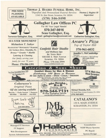 PRE-NEEDPLANNINGAVAILABLETuonnas J. Hucnns FuNnnu, Homtr, INC.\ And, Personalized Funeral Seruices Thomas J. Hughes IIIt240 St. Ann Street, Scranton, PA 18504 Supervisor570) 346-3498For All Your Legal Needs!570-347-9816Sean Gallagher, Esq.Terrence Gallagher, Esq. email: gallagherlaw@comcast.net Catherine Gattagher, Esq.Arcaro' s PizzaTop of Taylor Hill570-961-6032Gallagher Law Offices PCHallockT- E H,u.\SULTZER MONUMENTMichaeleen T. SultzerMAUSoLEUMS * MoxuunNts * Mlnxnns226 Northern Blvd., Chinchilla, PABronze * Granite * MarbleLettering & CleaningOur family serving yourfamily for over 70 yearsPhone: 570-586-1391fte Shoe SPeciatislsSiryP 1920Colaru.sso'sOriginal PizzaOff site catering availableMinooka * Clarks Summit * Dunmore880-0088 - 586-0608 - 344-9991Jennifer L. McCambridgeAttorneyLaw Offices of Jennifer L. McCambridge@;*-i'*i-s\Gomfort Shoes for Men & WomenOelelnalrne- IOO Z/eat@ de %u20acqa.ctaaaAll new styles & colors - Dness . Casueu ' SrueAreRSMEoICARE APPRoVED . w%u20ac accePt mo8t major insurancesStop by and check out our new stYlesCustom lnserts . Shoe Elev-ations . Arch Supports Refurbished ' Non-Custom ArchManaged IT ServicesIT SuppottWeb DeveloprnentSystern Adrninistration Phone: (57O) 589-OO99 - Web: HallockTechnologies'comMichael Montella, M.D.743 South Main Avenue Scranton, PA 18504(s7o) 969-0693CATALANO'S130 S, MAIN AVENUESCRANTON, PA 18504ConsultationVOIP Phone SysternsPC RepairSystern DesignConfetti Hair Studioand Wellness SpaBn Youn Bnsr936-938 S. Main AvenueScranton, PA 18504Phone 570.346.3999www. confettihai rstud io. com'frl]iS**,:,,'g6*', sxeffflrf;f'*t'cr\\ttE .J Plumbing . Heating '7tq*irt\\' Air Conditioning, lnc. 570-344-713124 Hour Emergency Service<\'50 ^M ?rlorMoM \\r')