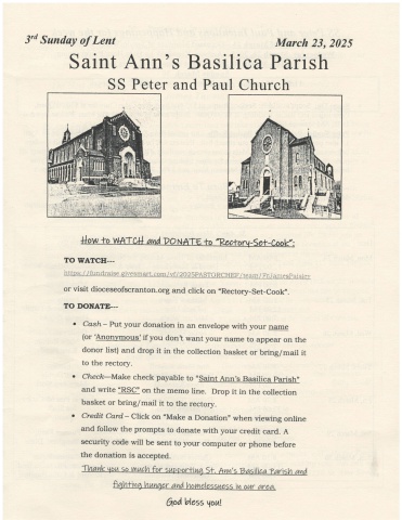 3'd Sunday of Lent March 23, 2025Saint Ann's Basiltca ParishS S Peter and Paul ChurchTO WATCH..-a{j.pf.l-llriry|1Algg.gj,rpqqrelt.comi vfl--_?g2SpASTORe.HEV:grUrV.]di_i4;lsrisfa.iqj,:t,or visit dioceseofscranton.org and click on \TO DONATF..-o cash- Put your donation in an envelope with your name(or 'angnymgus'if you don't want your name to appear on thedonor list) and drop it in the collection basket or bring/mail itto the rectory.o ch-eck-Make check payable to ,,Saint Ann,s Basilica parish\and write \ on the memo line. Drop it in the collectionbasket or bring/mail it to the rectory.o credit card- click on \ a Donation\ viewing onlineand follow the prompts to donate with your credit card. Asecurity code will be sent to your computer or phone beforethe donation is accepted.Qod bless qoa!