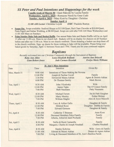 SS Peter and Paul Intentions and Happenings for the weekCandle week of March 30-Janet Bakoski by Lasota FamilyWednesday. April2. 2025-Romayne Nerch by Gene CudoSundav. April 6. 2025-Mary Kost by Daughter: ChristineSundav April 611:00 AM Lector: Christine Loyek EMC: Paulette Burton. Sggpgon:- Soups available: Seafood Bisque at $15.00/Quart, Red Clam Chowder at $10.00/Quart,Pasta Fagoli and Italian Wedding, at $8.00/Quart. Soups are sold after 9:00 AM Mass Wednesdays andl1:00 AM Mass on Sundays.o Palm Sundav Bake Sale and Basket Raffle Our annual Bake Sale and Basket Raffle will be on April13 after our 11:00 a.m. Mass in our church hall. Baskets will be on display for chances on all Sundaysbefore and after our I 1:00 a.m. Mass in our church vestibule. Those donating a basket can drop them offin the church vestibule. Sign- up sheets for those wishing to bake will be available. Please bring yourbaked goods by Saturday, April 12 between Noon and 3 PM. Thank you for your continued support.BaptismsRecently welcomed into our Christian Community through the Sacrament of Baptism:Ruby Ann Allen Luna Elizpbeth Belfanti Aurora Ann DriscollLiam Robert Jones Jude Carmen Krowiak Evelyn Marie WilliamsDateMon, March 31Tue, April 1Wed, April2Thurs, April 3Fri, April4Sat, April 5Sun, April6Time8:00 AM12:00 PM3:30 PM6:00 PM8:30 AM12:00 PM7:00 PM8:30 AM12:00 PM7:00 PM8:30 AM12:00 PM7:00 PM8:30 AM12:00 PM7:00 PM8:30 AM4:00 PM8:30 AMI 1:00 AM7:00 PMSt. Ann's Mass IntentionsIntentionIntentions of Those Making the NovenaJoseph & Pauline CavallEdward & Maura AdrianDr Thomas GenityJohn J KosloskyJames TigheBarb NaumannMichael FerrettMarty MunleyWilliam MaglioLucy & Arthur GalloMildred RossiEdward GermataCatherine T BrennanDeceased Members Palys FamilyAlberta, Alfred & Janet PochaskiNellie & Rock CantarellaMargaret, Charles & Joseph NeushallStanley KobylusEdward & Maura AdrianGiven By:FamilyAgnes & Dennis AdrianMark BrownWifeThe O'Connor FamilyPatty NaumannJoe & Patti GaughanEsther MotsayAlex & Joyce MascelliDaughter & FamilyDaughter: Debbie & FamilyDaughter & FamilyAnne KoesFamilyFamilyFamilyCharles NeushallWife: Gerry & FamilyDennis & Agnes AdrianLiving & Deceased Members of St. Ann's Basilica Parish