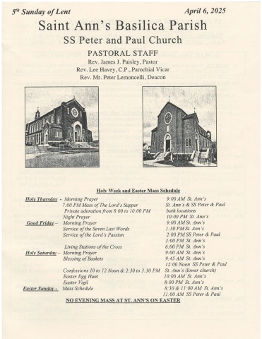 5'h Sunday of LentHolv Thursdav - Morning Prayer7:00 PM Mass of The Lord's SupperApril 6, 2025Saint Ann's Basilica ParishSS Peter and Paul ChurchPASTORAL STAFFRev. James J. Paisley, PastorRev. Lee Havey, C.P., Parochial VicarRev. Mr. Peter Lemoncelli, DeaconHoly Week and Easter Mass SchedulePrivate adorationfrom 8:00 to 10:0a PM both locationsNight PrayerGood Fridav - Morning PrayerService of the Seven Last WordsService of the Lord's PassionLiving Stations of the CrossHolv Saturclav - Morning PrayerBlessing of BasketsConfessions l0 to l2 Noon & 2:30 to 3.3A PMEaster Egg HuntEaster VigilEaster Sundav - Mass Schedule9:00 AM St. Ann'sSt. Ann's & SS Peter & Paull0:00 PM St. Ann's9:00 AM St. Ann's1:30 PM St. Ann's2:00 PM SS Peter & Paul3:00 PM St. Ann's6:00 PM St. Ann's9:00 AM St. Ann's9:45 AM St. Ann's12:00 Noon SS Peter & PaulSt. Ann's (ower church)10:00 AM St. Ann's8:00 PM St. Ann's8:30 & 11:00 AM St. Ann'sl1:00 AM SS Peter & PaulNO EVENING MASS AT ST. ANN'S ON EASTER