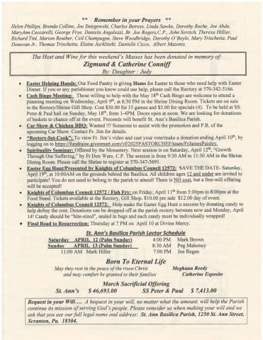 'r* Remember in yoar Prayers **Helen Phillips, Brenda Collins, Joe Sniegowski, Charles Betress, Linda Sawko, Dorothy Roche, Joe Abdo,MaryAnn Ceccarelli, George Frye, Daniela Angalozzi, Br. Joe Rogers,C.P., John Sovitch, Theresa Hillier,Richard Tini, Marion Reuther, Ceil Champagne, Steve Woodbridge, Dorothy O'Boyle, Mary Trischetta, PaulDonovan Jr., Thomas Trischetta, Elaine Jqcklinski, Danielle Cicco, Albert Mazonis.The Host and Winefor this weekend's Masses has been donated in memory of:Zigmund & Catherine ConniffEaster Helpins Hands: Our Food Pantry is giving Hams for Easter to those who need help with EasterDinner. If you or any parishioner you know could use help, please call the Rectory at 570-342-5166.Cash Bineo Meetine: Those willing to help with the May 18th Cash Bingo are welcome to attend aplanning meeting on Wednesday, April 9ff, at 6:30 PM in the Shrine Dining Room. Tickets are on salein the RectoryiShrine Gift Shop. Cost $30.00 for 15 games and $5.00 for specials (a). To be held at SS.Peter & Paul hall on Sunday, May l8th, from 1-4PM. Doors open at noon. We are looking for donationsof baskets to chance off at the event. Proceeds will benefit St. Ann's Basilica Parish.Car Show & Chicken BBO: Wanted !!! Someone to assist with the promotion and P.R. of theupcoming Car Show. Contact Fr. Jim for details.\-Set-Cook\ To view Fr. Jim's video and cast your vote/make a donation ending April l0th, bylogging on to https:i/fundraise.givesmart.com/vf/2025PASTORCHEF/team/FrJamesPaisley.Spiritualitv Seminar: Offered by the Monastery. Next session is on Saturday, April 12ft, \Through Our Suffering,\Dining Room. Please call the Shrine to register at 570-347-5691.Easter Ese Hunt/Presented bv Kniehts of Columbus Council 12572: SAVE THE DATE- Saturday,April 19th, at 10:00AM on the grounds behind the Basilica. All children ages 12 and under are invited toparticipate! You do not need to belong to the parish to attend! There is NO cost, but a free-will offeringwill be accepted!Kniehts of Columbus Council 12572 / Fish Frv: on Friday, April 1 lft from 5:00pm to 8:00pm at theFood Stand. Tickets available at the Rectory, Gift Shop. $10.00 pre sale $12.00 day of event.Kniehts of Columbus Council 12572: Help make the Easter Egg Hunt a success by donating candy tohelp defray the cost. Donations can be dropped off at the parish rectory between now and Monday, April14! Candy should be \Final Road to Resurrection: Thursday at 7 PM on April 10 at Divine Mercy.St. Ann's Basilica Parish Lector Schedule4:00 PM Mark Brown8:30 AM Peg Mahoney7:00 PM Joe ReganBorn To Eternal LWMay they rest in the peace of the risen Christ Meghann Reedyand may comfort be granted to their families Catherine EspositoM arch S acriticial OfferingBequest in your Will.... A bequest in your will, no matter what the amount, will help the Parishcontinue its mission of serving God's people. Please consider us when making your will and weask that you use our full legal nome and address: ,SL Ann Bosilico Parish, 1250 St. Ann Street,Scranlon, Pa. 18504.Saturday APRIL 12 (Palm Sundav)Sundav APRIL 13 (Palm Sunday)1l:00 AM Mark HillerSt. Ann's $ 46,693.00 SS Peter & Paul $ 7,413.00