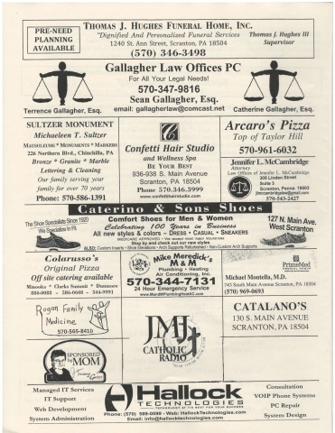 PRE.NEEDPTANNINGAVAILABLETuom,r,s J. Hucnns Fuxnnal Honnn, INC.\ And Personalized Funeral Seruices Thomas J. Hughes IIItZ40 St. Ann Street, Scranton, pA 18504 Supervisor570) 346-3498Gallagher Law Offices PCFor All Your Legal Needs!570-347-9816Sean Gallagher, Esq.email: gallag herlaw@comcast. net Terrence Gallagher, Esq.SULTZER MONUMENTMichaeleen T. SultzerMAUSoLEUMS * MotttlttIpNTs * MARKERS226 Northern Blvd., Chinchilla, PABronze * Granite * MarbleLettering & CleaningOur family serving Yourfamily for over 70 YearsPhone: 570-586-1391Colarusso'sOriginal PizzaOff site catering availableMinooka * Clarks Surnrnit * Dumnore880-0088 - 586-0608 - 344-9991Gomfort Shoes for Men & Womeneeledaart r\? OO ZTe,aza tto Baa':o*aaAll new styles & colors - Dness ' ClsuRl-' St'tElt