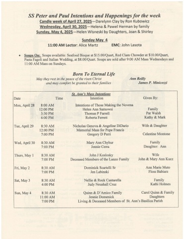 SS Peter and Paul Intentions and Happenings for the weekCandle week of April 27, 2025-Darelynn Clay by Ron KubowiczWednesdav. April 30, 2025-Helena & Pawel Herman by familySundav, Mav 4. 2025-Helen Wisneski by Daughters, Joan & ShirleySundav Mav 411:00 AM Lector: Alice Martz EMC: John Lasota. Sg@_ Soups available: Seafood Bisque at $15.00/Quart, Red Clam Chowder at $10.00/Quart,Pasta Fagoli and Italian Wedding, at $8.00/Quart. Soups are sold after 9:00 AM Mass Wednesdays andl1:00 AM Mass on Sundays.Born To Eternal LifeMay they rest in the peace of the risen Christand may comfort be granted to their familiesAnn ReillyJames P. MinicoaiDateMon, April23Tue, April29Wed, April30Thurs, May 1Fri, May 2Sat, May 3Sun, May 48:00 AM12:00 PM3:30 PM6:00 PM8:30 AM12:00 PM7:00 PM8:30 AM7:00 PM8:30 AM7:00 PM8:30 AM7:00 PM8:30 AM4:00 PM8:30 AMI l:00 AM7:00 PMTimeJohn J KosloskyGiven By:FamilyPat WalshKathy & MarkWife & DaughterCelestine MontoneFamilyDaughter: AnnWifeDeceased Members of the Lanzo Family John & Mary Ann KuczSt. Ann's Mass IntentionslntentionIntentions of Those Making the NovenaHelen Ann SarnowsiThomas P FarrellRoberta FerrettNicholas Genova & Angeline DiDarioMemorial Mass for Pope FrancisGregory D PeniMary Ann ChyhurJennie CerraDominick Scartelli SrJen LabinskiNellie & Rock CantarellaJudy Neushall CruzQuinn & D'Amico FamilyJennie DomenickAnn Marie MutoFloss BabiarzFamilyKathi HolmesCarol Quinn & FamilyDaughtersLiving & Deceased Members of St. Ann's Basilica Parish