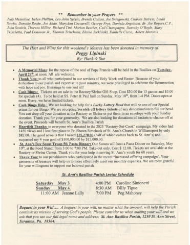 'r'* Remember in your Prayers **Judy Messoline, Helen Phillips, Leo John Syrylo, Brenda Collins, Joe Sniegowski, Charles Betress, LindaSawlro, Dorothy Roche, Joe Abdo, MaryAnn Ceccarelli, George Frye, Daniela Angalozzi, Br. Joe Rogers,C.P.,John Sovitch, Theresa Hillier, Richard Tini, Marion Reuther, Ceil Champagne, Dorothy O'Boyle, MaryTrischetta, Paul Donovan Jr., Thomas Trischetta, Elaine Jacklinski, Danielle Cicco, Albert Mazonis.The Host and Winefor this weekend's Masses has been donated in memory ofPeggy Lipinski': Hank & Sue. A-@gde!-@: for the repose of the soul of Pope Francis will be held in the Basilica on Eggdgy,Anril2gth. at noon. All are welcome..@toallwhoparticipatedinourservicesofHolyWeekandEaster.Becauseofyourdedication to our parish and expertise in your ministry, we were privileged to celebrate the Resurrectionwith hope and joy. Blessings to one and all!. Qgg[Eigre;- Tickets are on sale inthe Rectory/Shrine Gift Shop. Cost $30.00 for 15 games and $5.00for specials (4). To be held at SS. Peter & Paul hall on Sunday, May 18ft, from l-4 PM. Doors open atnoon. Hurry, we have limited tickets.. -El4gg-HjJp-i We are looking for help for a Lucky Lottery Bowl that will be one of our Specialprizes for our Bingo. We are accepting Scratch offlottery tickets of any denomination to fill our bowl,You can drop offyour donation at the Rectory or Shrine or put them in an envelope with your Sundaydonation. Thank you for your generosity. We are also looking for donations of baskets to chance off atthe event. Proceeds will benefit St. Ann's Basilica Parishe Heartfelt Thanks: to everyone who donated to the 2025 \1450 views and I lost first place to Fr. Shawn Simchock of St. Ann's Church in Williamsport by only.$S2.00. The good news is that I raised $35.270.00 (half of which comes back to St. Ann's) andsurpassed my 4 year goal of $100,000.00 by $15,000.00.o St. Ann's Boy Scout Troop 50/ Pasta Dinner: Our Scouts will host a Pasta Dinner on Saturday, May1Oft, at the Food Stand, from 3:00 to 7:00 PM. Take-out only. Cost $ 12.00. Tickets are available at theRectory or Shrine Center. Thank you for your help in serving St. Ann's youth for 68 years..I@,toourparishionerswhoparticipatedintherecento.increasedofferingcampaign,.Yourgenerosity of treasure will help us to more effectively meet our monthly expenses. We are most gratefulfor your willingness to support our beloved parish.St. Ann's Basilico Porish Lector ScheduleSaturday Mav 3 4:00 PM Caroline SimonettiSundav Mav 4 8:30 AM Billy Tigue11:00 AM Jeanne Lally 7:00 PM Peg MahoneyBequest in your Will.... A bequest in your will, no matter what the amount, will help the Parishcontirute its mission of serving God's people. Please consider us when making your will and weask that you use our full legal name and address: ^Sr. Ann Basilica Parish, 1250 St. Ann Street,Scranton, Pa. 18504.