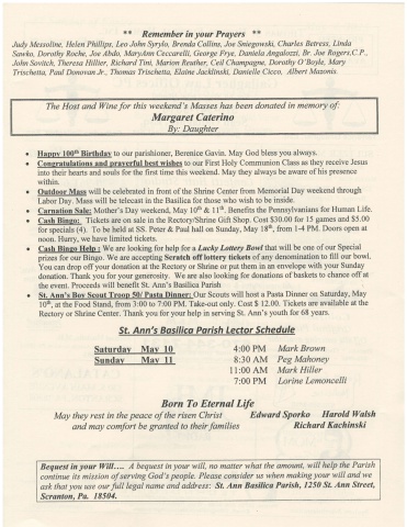 ** Remember in your Prayers 'F'FJudy Messoline, Helen Phillips, Leo John Syrylo, Brenda Collins, Joe Sniegowski, Charles Betress, LindaSawko, Dorothy Roche, Joe Abdo, MaryAnn Ceccarelli, George Frye, Daniela Angalozzi, Br. Joe Rogers,C.P.,John Sovitch, Theresa Hillier, Richard Tini, Marion Reuther, Ceil Champagne, Dorothy O'Boyle, MaryTrischetta, Paul Donovan Jr., Thomas Trischetta, Elaine Jacklinski, Danielle Cicco, Albert Mazonis.The Host and Winefor this weekend's Masses has been donated in memory of:Murgaret Caterino': DaushterHappv 100th Birthdav to our parishioner, Berenice Gavin. May God bless you always.Congratulations and praverful best wishes to our First Holy Communion Class as they receive Jesusinto their hearts and souls for the first time this weekend. May they always be aware of his presencewithin.Outdoor Mass will be celebrated in front of the Shrine Center from Memorial Day weekend throughLabor Day. Mass will be telecast in the Basilica for those who wish to be inside.Carnation Sale: Mother's Day weekend, May lOth & I1ft. Benefits the Pennsylvanians for Human Life.Cash Bineo: Tickets are on sale in the Rectory/Shrine Gift Shop. Cost $30.00 for 15 games and $5.00f* rpectats (4). To be held at SS. Peter & Paul hall on Sunday, May 18fr, from l-4 PM. Doors open atnoon. Hurry, we have limited tickets.Cash Bineo Heln : We are looking for help for a Lucky Lottery Bowl that will be one of our Specialprizes for our Bingo. We are accepting Scratch off lottery tickets of any denomination to fill our bowl.You can drop off your donation at the Rectory or Shrine or put them in an envelope with your Sundaydonation. Thank you for your generosity. We are also looking for donations of baskets to chance off atthe event. Proceeds will benefit St. Ann's Basilica ParishSt. Ann's Bov Scout Troop 50/ Pasta Dinner: Our Scouts will host a Pasta Dinner on Saturday, May10th, at the Food Stand, from 3:00 to 7:00 PM. Take-out only. Cost $ 12.00. Tickets are available at theRectory or Shrine Center. Thank you for your help in serving St. Ann's youth for 68 years.oaaoSaturdav Mav 10Sundav Mav 114:00 PM Mark Brown8:30 AM Peg MahoneyI 1:00 AM Mark Hiller7:00 PM Lorine LemoncelliBorn To Eternnl LWMay they rest in the peace of the risen Christ Edward Sporko Harold Walshand may comfort be granted to their families Richard KachinskiBeqaest in your Will.... A bequest in your will, no matter what the amount, will help the Parishcontinue its mission of serving God's people. Please consider us when making your will and weask that you use our full legal name and address: ,SL Ann Basilica Parish, 1250 St. Ann Street,Scranton, Pa, 18504.St. Ann's Bosilico Pqrish Lector Schedule
