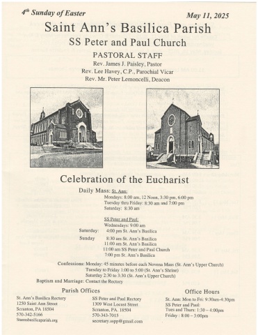 4th Sunday of Easter May Il, 2025Saint Ann's Basiltca ParishSS Peter and Paul ChurchPASTORAL STAFFRev. James J. Paisley, pastorRev. Lee Havey, C.P., Parochial VicarRev. Mr. Peter Lemoncelli, DeaconCelebration of the EucharistDaily Mass: St. Ann:Mondays: 8:00 am, 12 Noon,3:30 pm,6:00 pmTuesday thru Friday: 8:30 am and 7:00 pmSaturday: 8:30 amSS Peter and Paul:Wednesdays: 9:00 amSaturday: 4:00 pm St. Ann,s BasilicaSunday 8:30 am St. Ann's Basilica11:00 am St. Ann's Basilica1 1:00 am SS Peter and Paul Church7:00 pm St. Ann's BasilicaConfessions: Monday: 45 minutes before each Novena Mass (St. Ann's Upper Church)Tuesday to Friday 1:00 to 5:00 (St. Ann,s Shrine)Saturday 2:30 to 3:30 (St. Ann,s Upper Church)Baptism and Marriage: Contact the RectoryParish OfficesSt. Ann's Basilica Rectory1250 Saint Ann StreetScranton, PA 18504570-342-5t66Stannsbasi I icaparish.orgSS Peter and Paul Rectory1309 West Locust StreetScranton, PA. 18504570-343-7015secretary.sspp@ gmail.comOffice HoursSt. Ann: Mon to Fri: 9:30am-4:30pmSS Peter and Paul:Tues and Thurs: 1:30 - 4:00prnFriday:8:00-3:00pm