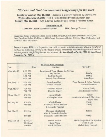 SS Peter and Paul Intentions and Happenings for the weekCandle for week of Mav 11, 2O25-Zabielski & Gowarty Families by Mary & AnnWednesdav. Mav 14.2025-Ted & Helen Sklarski by Frank & Helen ZackSundav. Mav 18. 2025-Ruth & James Burton by Son, James & Paulette BurtonSundav Mav 1811:00 AM Lector:Joan MacDonald EMC: George Thomas. Sggp@- Soups available: Seafood Bisque at $15.00/Quart, Red Clam Chowder at $10.00/Quart,Pasta Fagoli and Italian Wedding, at $8.00/Quart. Soups are sold after 9:00 AM Mass Wednesdays and1l:00 AM Mass on Sundays.Bequest in your Witl.... A bequest in your will, no matter what the amount, will help the Parishcontinue its mission of serving God's people. Please consider us when making your will and weask that you use our full legal nome and address: S/. Ann Basilica Parish, 1250 St. Ann Street,Scranton, Pa. 18504.St. Ann's Mass IntentionsDate Time Intention Given BY:Mon, May 12 8:00 AM Intentions of Those Making the Novena12:00 PM RaY Verdine FamilY3:30 PM Beatrice Biagioli FamilY6:00 PM James & Mary Brennan Anne KoesTue, May 13 8:30 AM Sante Romaldini Floss Babiarz & JoAnn Arlandis7:00 PM Eleanor Montone Celestine MontoneWed, May 14 8:30 AM Thomas Kavulich Coccia Family7:00 PM Dorothy Bracey Alex & Joyce MascelliThurs, May 15 8:30 AM Leonard Gallo Family7:00 PM Christopher Musti Antoinette Martino & Mary AnnHayes KuczFri, May 16 8:30 AM Cassie Kaleta Family7:00 PM Cadden, O'Toole, Sheridan Family& Ingoldsby Familieslsat, May 17 8:30 AM Deceased Members of FamilyMuto & Cantarella Families4:00 PM Bernadette Halpin-Phillips FamilySun, May 18 8:30 AM Marian Anticoli Marie Gregorski &Pat Spindler11:00 AM Katie Pfister Mom & Dad7:00 PM Ann P Hoffinan Gail & Andy Hurchick