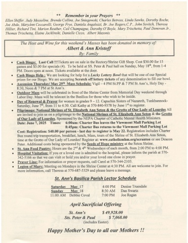 it'F Remember in your Prayers :l':&Ellen Shffir, Judy Messoline, Brenda Collins, Joe Sniegowski, Charles Betress, Linda Satvko, Dorothy Roche,Joe Abdo, MaryAnn Ceccarelli, George Frye, Daniela Angalozzi, Br. Joe Rogers,C.P., John Sovitch, TheresaHillier, Richard Tini, Marion Reuther, Ceil Champagne, Dorothy O'Boyle, Mary Trischetta, Paul Donovan Jr.,Thomas Trischetta, Elaine Jacklinski, Danielle Cicco, Albert Mazonis.The Host and Winefor this weekend's Masses has been donated in memory of:Albert & Ann Kristoff: FamiCash Bingo: Last Call !!lTickets are on sale in the Rectory/Shrine Gift Shop. Cost $30.00 for 15gr-\PM. Doors open at noon. Tickets available at the door.Cash Bineo Help : We are looking for help for a Lucky Lottery Bowl that will be one of our Specialprizes for our Bingo. We are accepting Scratch off lottery tickets of any denomination to fiIl our bowl.Ascension Thursdav/ Mav 29th Mass Schedule: Vigil - 4 PM St.PP &7 PM St Ann's, Holy Day -8:30, Noon & 7 PM at St Ann's.Outdoor Mass will be celebrated in front of the Shrine Center from Memorial Day weekend throughLabor Day. Mass will be telecast in the Basilica for those who wish to be inside.Dav of Renewal & Prayer for women in grades 9 - 12. Capuchin Sisters of Nazareth, TunkhannockSaturday, June 7ft, from 11 to 4:30. Call Kathy at 570-840-9378 by June 1't to register.Pilerimase: National Shrines of St. Elizabeth Ann Seton & the Grotto of Our Ladv of Lourdes Allare invited to join us on a pilgrimage to the National Shrines of St. Elizabeth Ann Seton & the Grottoof Our Ladv of Lourdes, Sponsored by the NEPA Chapter of Catholic Mental Health Ministers'Date: June 7,2025 Times: 6:00am: Charter Bus leaves the Viewmont MalI Parking Lot8:45pm: Charter Bus returns to the Viewmont Mall Parking LotCost: Registration: $40.00 per person - last day to register is May 22. Registration includes CharterBus round trip transportation, breakfast, lunch, Mass, tours of the Shrine of St. Elizabeth Ann Seton,time at the Grotto of Our Lady of Lourdes! Register at: www.catholicmhm.org/scranton or see DeaconPeter. Additional costs being sponsored by the Seeds of Hope ministrv at the Seton Shrine.St. Ann Food Pantrv: Hours are the 2\Hospital Visitation: If you or a loved one is admitted to the hospital, please inform the parish at 570-342-5166 so that we can visit or hold you and/or your loved one close in prayer.Praver Line: For information or prayer tequests, call Carol at570-344-2103.Lesion of Marv: Meeting on Mondays in the Shrine Center at 4:30 PM. All are welcome to join. Formore information, call Theresa at 570-687-5329 and please leave a message.St. Ann's Bosilico Parish Lector ScheduleaaaaApril S acriJicial Olfering(includes Easter)Happy Mother's Day to all our Mothers ! !Saturdav Mav 17Sundav Mav 1811:00 AM Debbie Coval4:00 PM Denise Truesdale8:30 AM Dan Swartz7:00 PM Joe Regan$ 49,928,00$ 7,068.00St. Ann'sSts. Peter & Paul