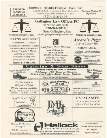 PRE.NEEDPLANNINGAVAITABLETgomas J. Hucnrs Fuxnnq,l HonnB, INC.\ And Personalized Furueral Seruices Thomas J, Hughes IIIL240 St. Ann Street, Scranton, PA 18504 Supervisor57O) 346-3498Gallagher Law Offices PCFor All Your Legal Needs!570-347-9916Sean Gallagher, Bsq.Terrence Gallagher, Esq. email : gallagherlaw@comcast.net Catherine Gallagher, Esq.SULTZER MONUMENTMichaeleen T. SultzerMausolruus * MoNutvtuNTS * MARKERS226 Northern Blvd., Chinchilla, PABronze * Granite * MarbleLettering & CleaningOur family serving yourfamily for over 70 yearsPhone: 570-586-1391fte Shoe SPecrahsts Sirle 1920Cola,ru.sso'sOriginal PizzaOff site catering availableMinooka * Clarks Surnmit * Dumnore880-0088 - 586-0608 - 344-999tStop by and check out our new stylesCustom lnserts . Shoe Elevations . Arch Supports Refurbished ' Non-Custom ArchManaged IT SerwicesIT SupportWeb DeveloprnentSystern AdrninistrationHallcrck rE F.,u.\ ^,T\\.E, : \Phone: (57O) 589-OO99 - Web: HallockTechnologies.comArcaro's PizzaTop of Taylor Hill570-961-6032Jennifer L. McCambridgeAttorneyLaw Offices of Jennifer L. McCambridge@#*'*iqi;*,.*Gomfort Shoes for Men & WomeneeleZq4rc:rc\All new styles & colors - Dness . Clsult- . SttEAxeRsMEDICARE APPROVEO . We accpt most major insurances\\, . .ZINPrimeMed'IL:I:3.:JJ?I'Michael Montella,M.D.743 South Main Avenue Scranton, PA 18504(s70) 969-06e3CATALANO'S130 S. MAIN AVENUESCRANTON, PA 18504ConsultationVOIP Phone SysternsPC RepairSystern Designand Wellness SpaBn Youn Bnsr936-938 S. Main AvenueScranton, PA 18504Phone 570.346.3999www.confettihairstudio.coml0 )Itw ol-Y:l=--,.-r---We Sp'cratze tn Fit''-Bffi' r.*\,,*tPlumbing . HeatingAir Conditioning, lnc. 570-344-713124 Hour Emergency ServiceSPONSOREDl',MOM',i[l[S**,;'fqeJi.;neEmail: info@hallocktechnologies.comConfetti Hair Studioaterino & Sorls Shoes'9'n lonilY